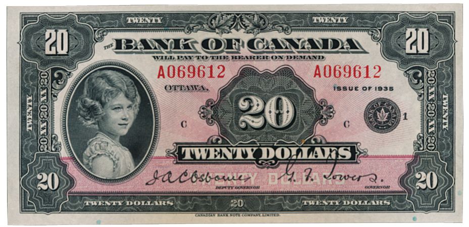 BANK OF CANADA. $20.00. 1935 Issue. English Text. BC-9b. Small Seal variety. No. A069612/C. A well centered and scarce Unc. Note.
