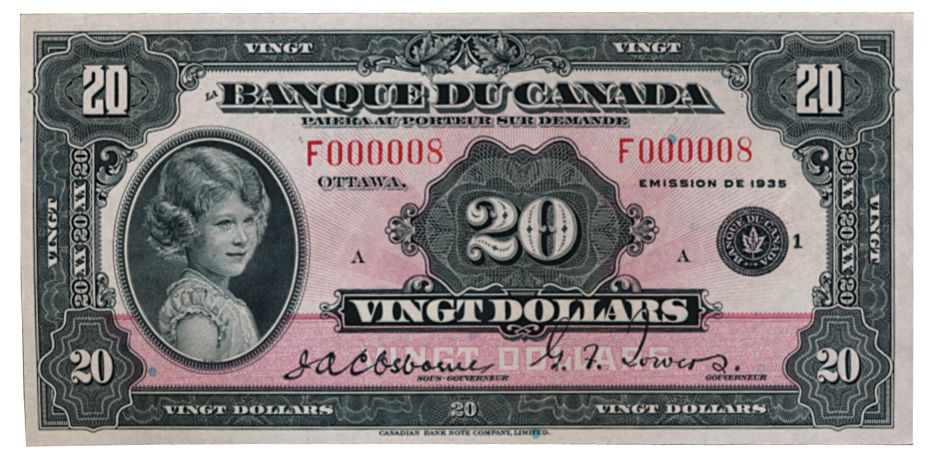 BANK OF CANADA. $20.00. 1935 Issue. French Text. BC-10. No. F000008/A. Another rare low serial numbered note. Well centered. A bright Unc.
