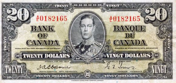 BANK OF CANADA. $20.00. 1937 Issue. BC-25a. Osborne-Towers. No. A/E0182165. PCGS graded Very Fine-20. Apparent. Small edge tear.