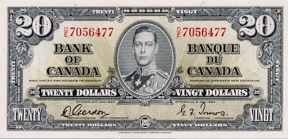 BANK OF CANADA. $20.00. 1937 Issue. BC-25b. Gordon- Towers. No. D/E7056477. BCS graded Almost Unc-50.