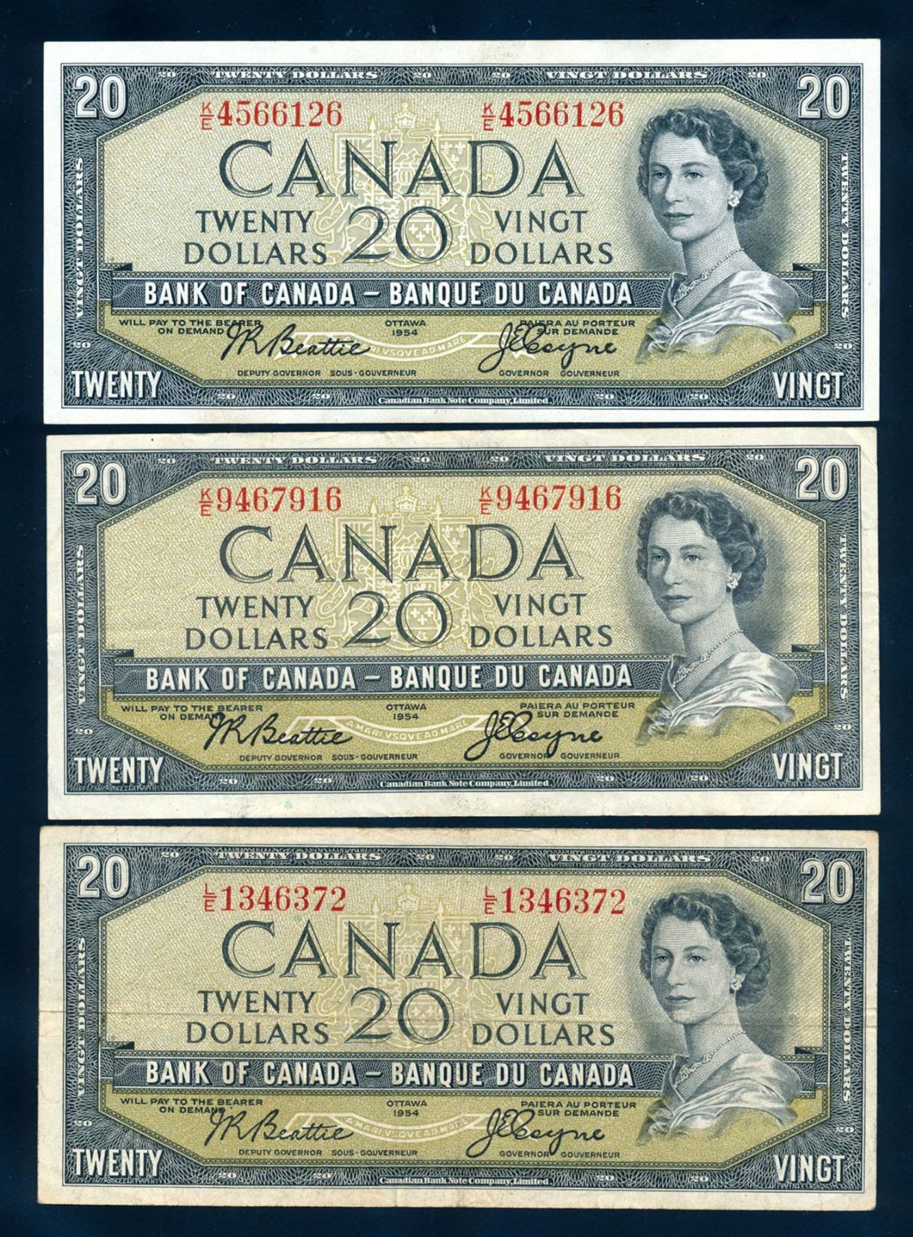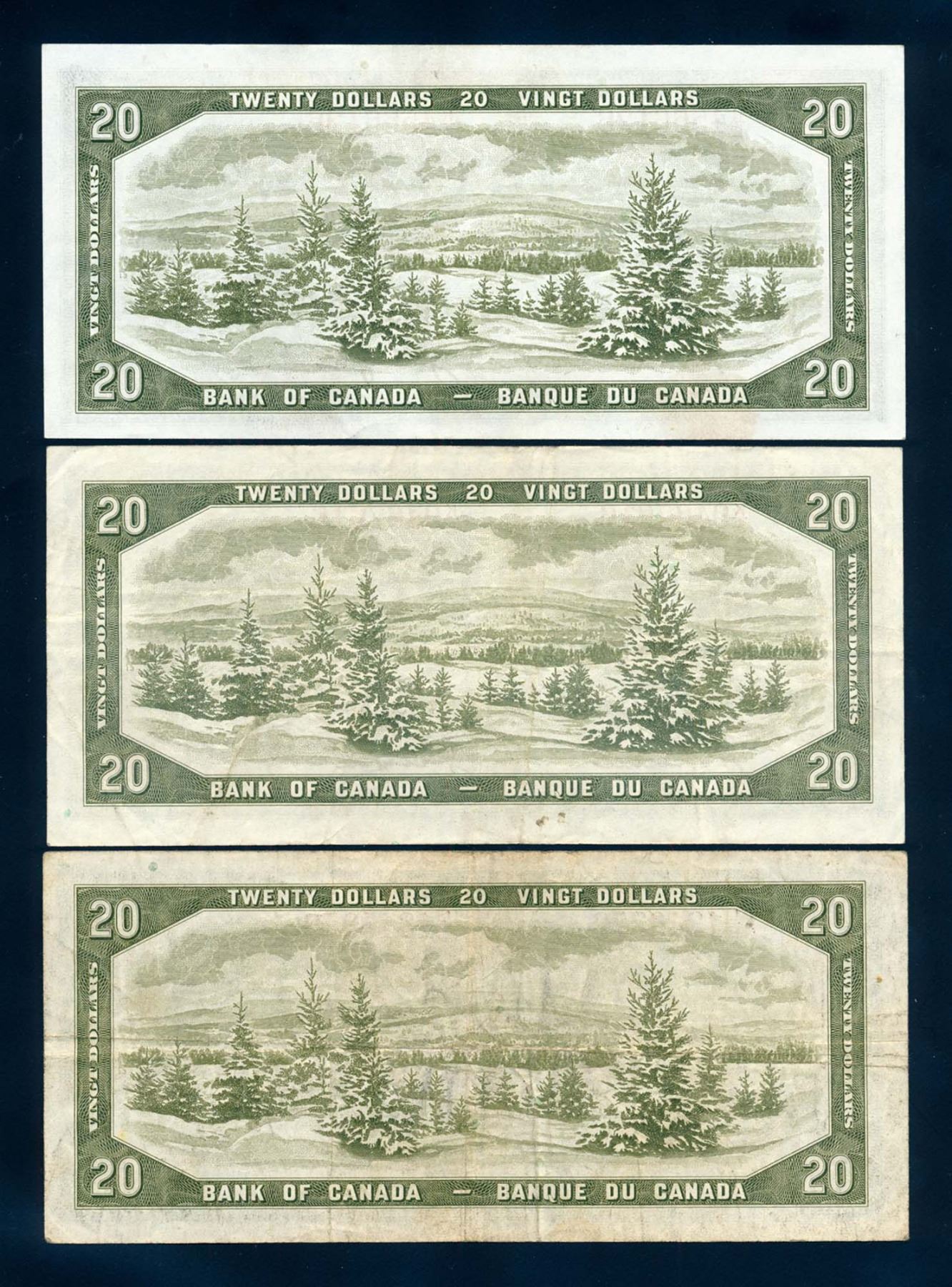 BANK OF CANADA $20.00 1954. A Lot of 3 BC-41a Modified Portrait Banknotes VG-UNC