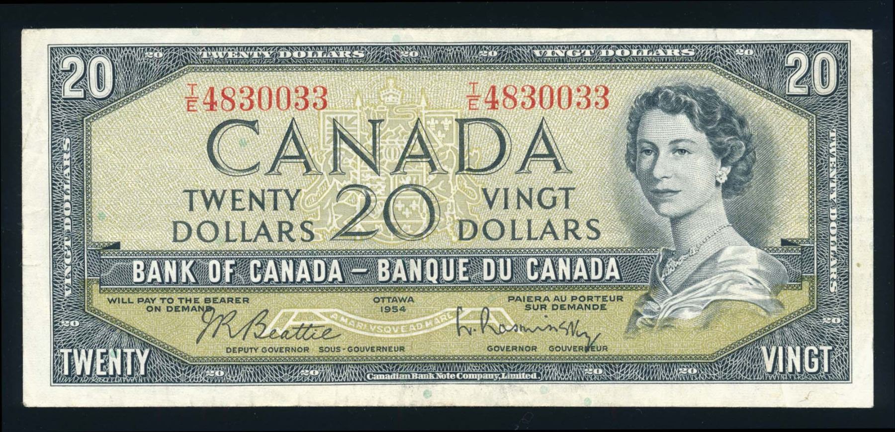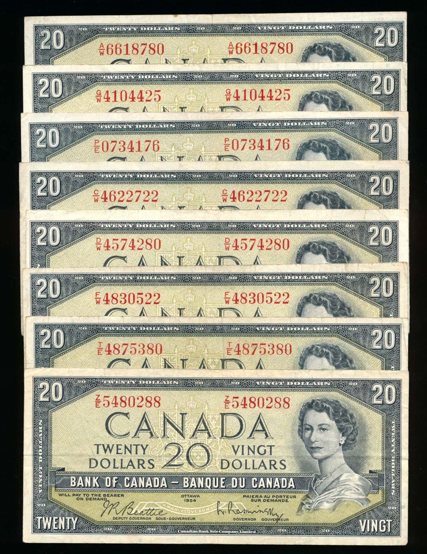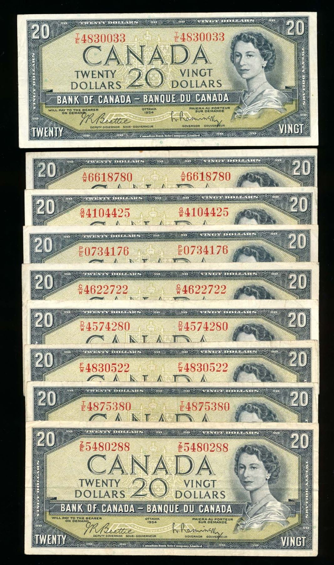 BANK OF CANADA $20.00 1954. A Lot of 9 BC-41b Modified Portrait Banknotes VG-VF