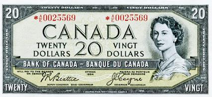 BANK OF CANADA. $20.00. 1954 Issue. BC-41Aa. No. *A/E0025569. Very Fine+.