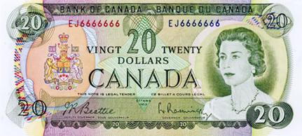 BANK OF CANADA. $20.00. 1969 Issue. BC-50a. Beattie-Rasminsky. No. EJ6666666. CU.