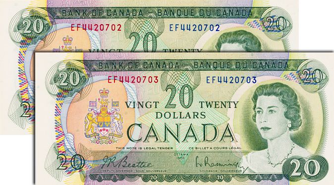 BANK OF CANADA. $20.00. 1969 Issue. BC-50a. Beattie-Rasminsky. No.’s EF4420702 & EF4420703. Both BCS graded Original Unc-60.