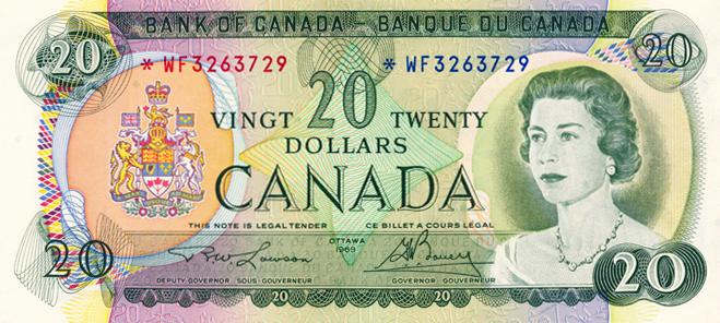 BANK OF CANADA. $20.00. 1969 Issue. BC-50a. No. *WF3263729. PCGS graded Choice Unc-64. PPQ.