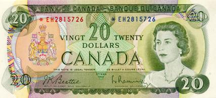 BANK OF CANADA. $20.00. 1969 Issue. BC-50aA. Beattie-Rasminsky. No. *E/H2815726. BCS graded Choice Unc-63. ‘Original’.