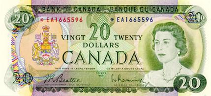 BANK OF CANADA. $20.00. 1969 Issue. BC-50aA. Beattie-Rasminsky. No. *EA1665596. Choice Unc-62.