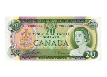BANK OF CANADA. $20.00. 1969 Issue. BC-50aA. No. *EV0000005. BCS graded Choice Almost Unc-58. A original rare replacement note, with a very low serial number.