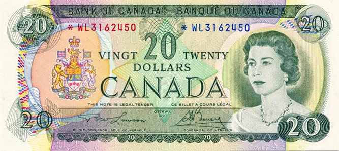 BANK OF CANADA. $20.00. 1969 Issue. BC-50aA. No. *WL3162450. PCGS graded Choice Unc-64. PPQ.