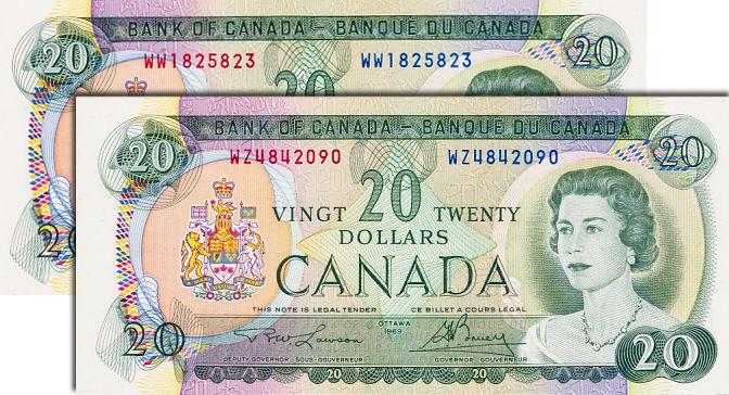 BANK OF CANADA. $20.00. 1969 Issue. BC-50b. Lawson-Bouey. No. WW1825823. BCS graded Original Unc-60; No. WZ4842090. BCS graded Original Unc-62. Lot of two (2) notes.