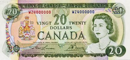 BANK OF CANADA. $20.00. 1969 Issue. BC-50b. Lawson-Bouey. No. WZ4000000. EF+.