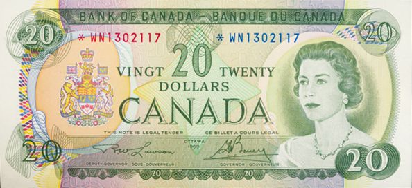 BANK OF CANADA. $20.00. 1969 Issue. BC-50bA. Lawson- Bouey. No. *WN1302117. CCCS graded Unc-60.