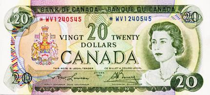 BANK OF CANADA. $20.00. 1969 Issue. BC-50bA. Lawson-Bouey. No. *WV1240545. CCCS graded Extra Fine-45. ‘pin holes’.
