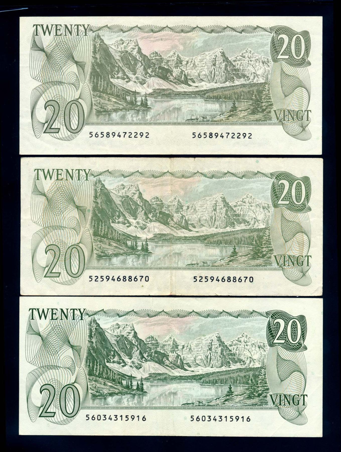 BANK OF CANADA $20.00 1979. A Lot of 3 BC-54 Banknotes Fine-UNC