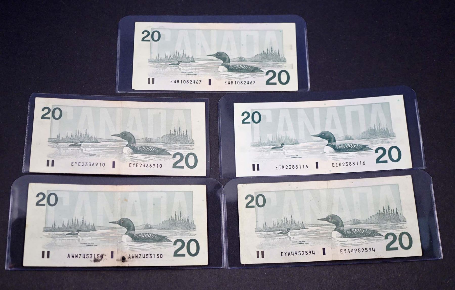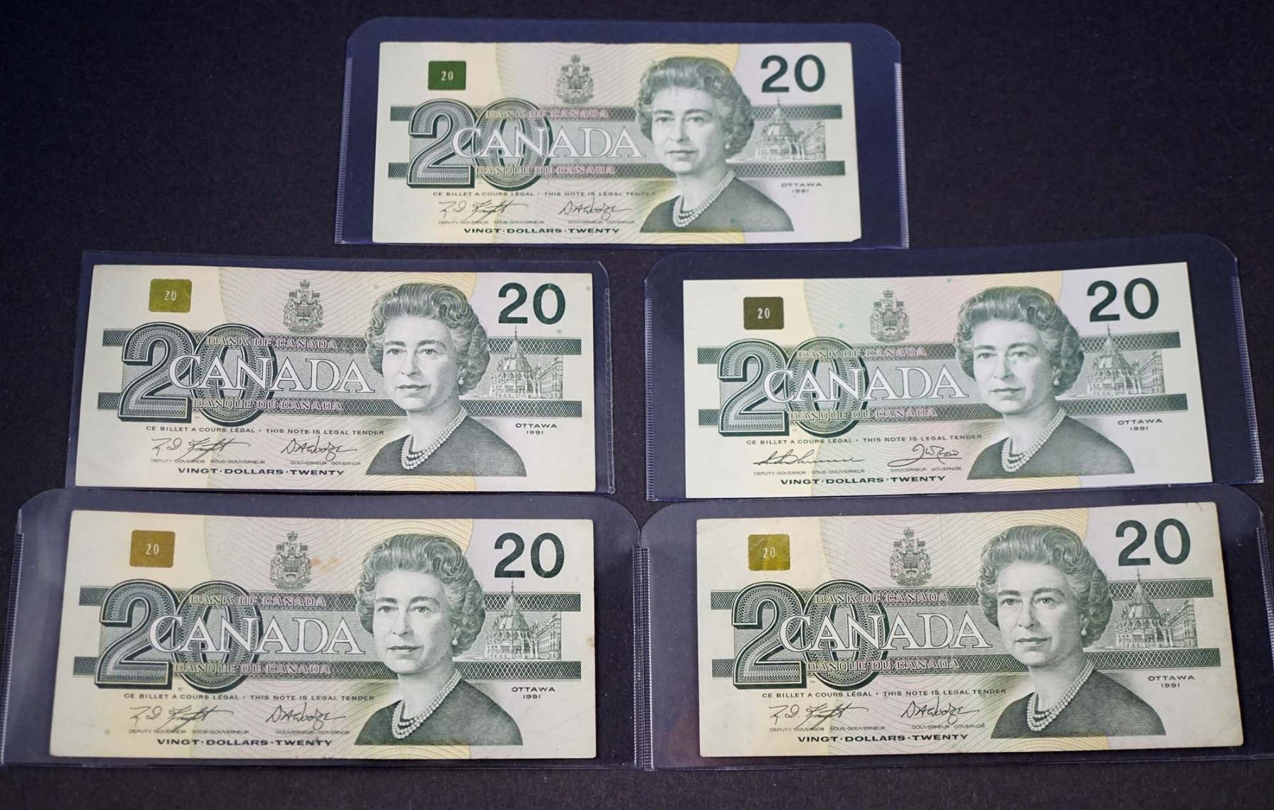 BANK OF CANADA $20.00 1991. A Lot of 5 BC-58 Mixed Signatures Banknotes EF-UNC