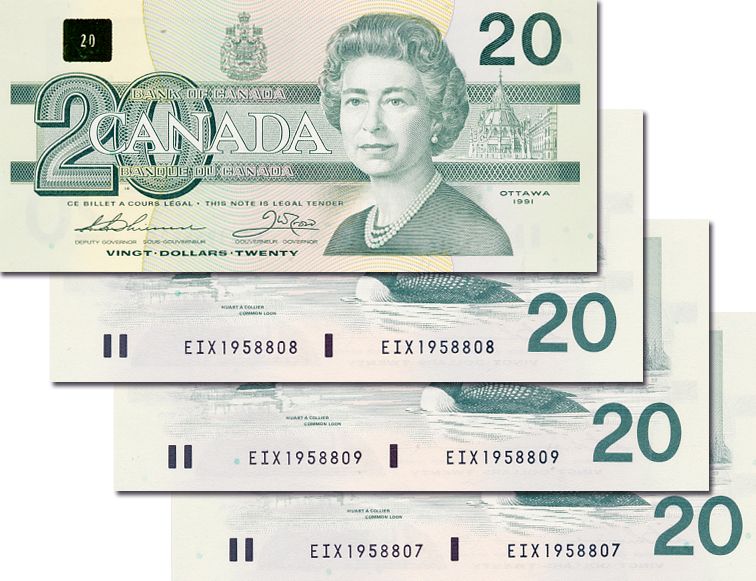 BANK OF CANADA. $20.00. 1991 Issue. BC-58aA-i. Thiessen-Crow. No. EIX1958806, 8807, 8808 & 8809. Lot