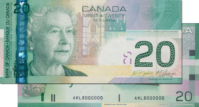 BANK OF CANADA. $20.00. 2008 Issue. BC-64b-i. Jenkins-Carney. No. ARL8000000. PMG graded Choice Unc-64.