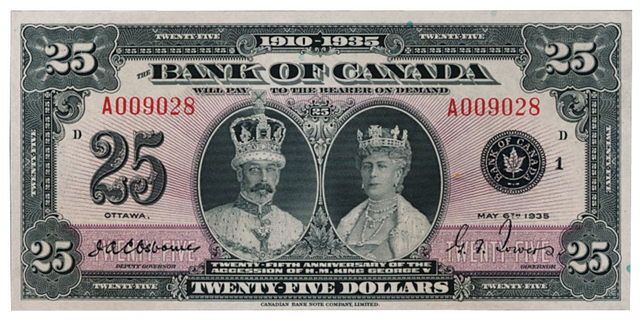 BANK OF CANADA. $25.00. 1935 Issue. English Text. BC-11. No. A009028/B. A choice AU note. Only a minor counting crease away from uncirculated.