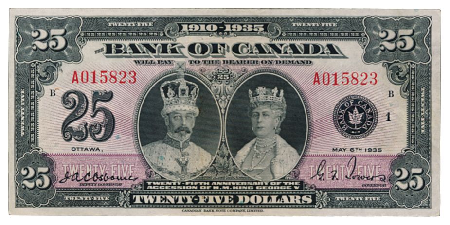BANK OF CANADA. $25.00. 1935 Issue. English Text. BC-11. No. A015823/B. A bright Extra Fine.