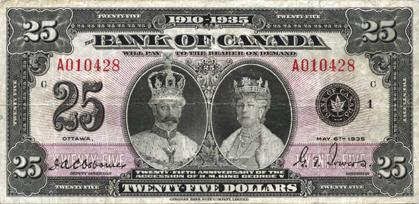 BANK OF CANADA. $25.00. 1935 Issue. English Text. Osborne. BC-11. No. A010428. PMG graded Very Fine-20.