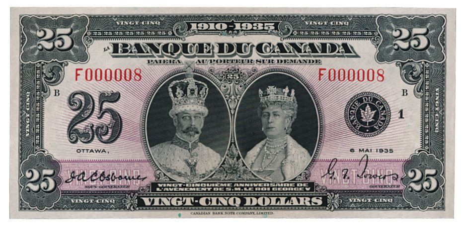BANK OF CANADA. $25.00. 1935 Issue. French Text. BC-12. No. F000008/B. Unlisted in the C.P.M.S. Registry. A bright, well centered choice AU note. A second low serial numbered French text note.