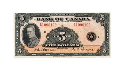 BANK OF CANADA. $5.00. 1935 Issue. BC-5. English Text. No. A1098192/D. PMG graded Choice Unc-63. EPQ.