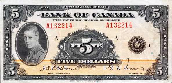 BANK OF CANADA. $5.00. 1935 Issue. English Text. BC-5. No. A132214/A. PCGS graded Very Fine-20. Apparent. Small edge split and minor ink marks.
