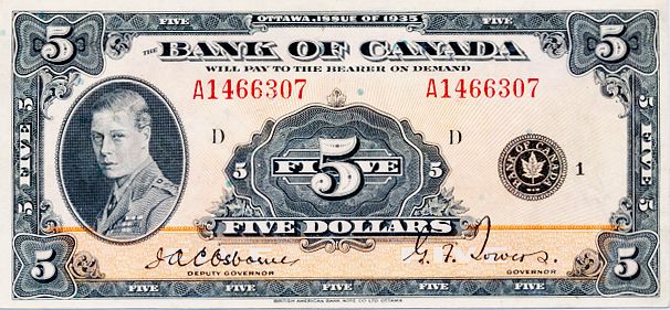 BANK OF CANADA. $5.00. 1935 Issue. English Text. BC-5. No. A1466307/D. BCS graded Very Fine-30.