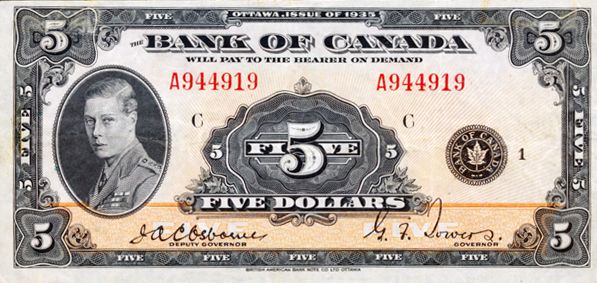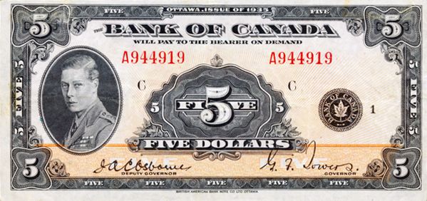 BANK OF CANADA. $5.00. 1935 Issue. English Text. BC-5. No. A944919/C. PMG graded Very Fine-30.