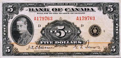 BANK OF CANADA. $5.00. 1935 Issue. English Text. Osborne. BC-5. No. A179763/D. BCS graded FINE-15.