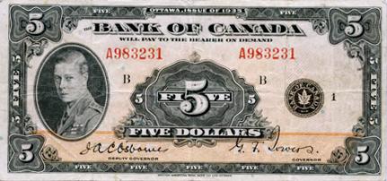 BANK OF CANADA. $5.00. 1935 Issue. English Text. Osborne. BC-5. No. A982321/B. BCS graded FINE-12.