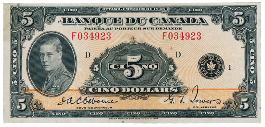 BANK OF CANADA. $5.00. 1935 Issue. French Text. BC-6. No. F034923/D. Close cut top margin. Unc.