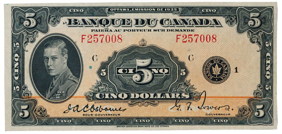 BANK OF CANADA. $5.00. 1935 Issue. French Text. BC-6. No. F257008/C. PCGS graded AU-58. A choice example, with the appearance of an Unc note.