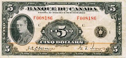 BANK OF CANADA. $5.00. 1935 Issue. French Text. Osborne. BC-6. No. F008186/C. PMG graded Very Fine-20.