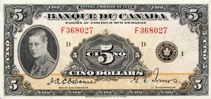 BANK OF CANADA. $5.00. 1935 Issue. French Text. Osborne. BC-6. No. F368027. PMG graded Very Fine-35.