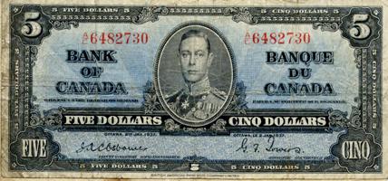 BANK OF CANADA. $5.00. 1937 Issue. BC-23a. Osborne. No. A/C6482730, A/C7656421, A/C8152284. All three (3) notes are VG.