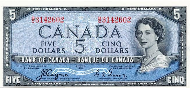 BANK OF CANADA. $5.00. 1954 Issue. BC-31a. 'Devil's Face'. Coyne-Towers. No. B/C3142602. Unc.