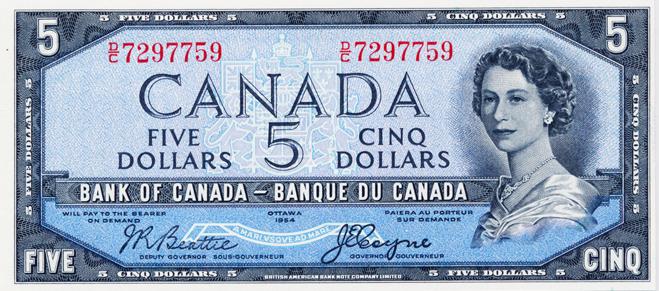 BANK OF CANADA. $5.00. 1954 Issue. BC-31b. 'Devil's Face'. Beattie-Coyne. No. D/C7297759. PMG graded Choice Unc-64. EPQ.