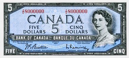 BANK OF CANADA. $5.00. 1954 Issue. BC-39b. Beattie-Rasminsky. No. Z/C8000000. AU.
