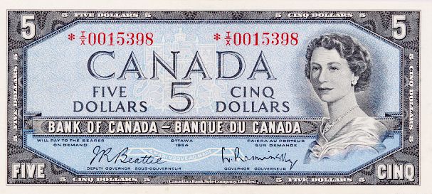 BANK OF CANADA. $5.00. 1954 Issue. BC-39bA. Beattie- Rasminsky. No. *I/X0015398. BCS graded Very Fine-35.