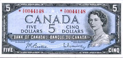 BANK OF CANADA. $5.00. 1954 Issue. BC-39bA. Modified. Beattie-Rasminsky. No. *I/A0044148 and *N/X0099130. Both BCS graded Very Fine-30.