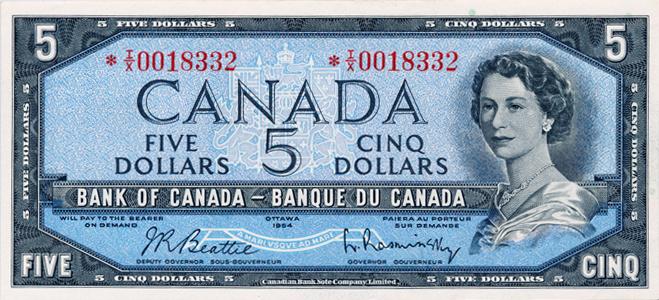 BANK OF CANADA. $5.00. 1954 Issue. BC-39bA. Modified. No. *I/X0018332. PMG graded CH AU-58.
