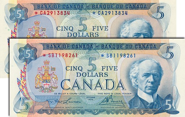 BANK OF CANADA. $5.00. 1972 Issue. BC-48aA. Bouey-Rasminsky. No. *CA2913834. CCCS graded Choice Unc-64; $5.00. 1972 Issue. BC-48bA. Lawson-Bouey. No. *SB1198261. CCCS graded Unc-62. Lot of two (2) replacement notes.