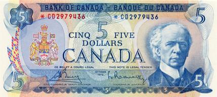 BANK OF CANADA. $5.00. 1972 Issue. BC-48aA. Bouey-Rasminsky. No. *CD2979436. PCGS graded Unc-65. PPQ.