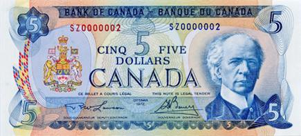 BANK OF CANADA. $5.00. 1972 Issue. BC-48b. Lawson-Bouey. No. SZ0000002. CU.