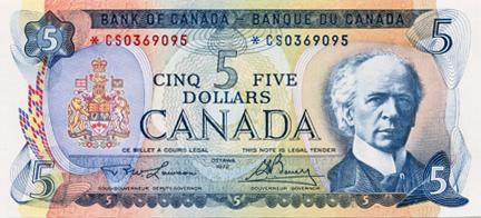 BANK OF CANADA. $5.00. 1972 Issue. BC-48bA. Lawson-Bouey. No. *CS0369095. CCCS graded Extra Fine-40. A scarcer replacement note.