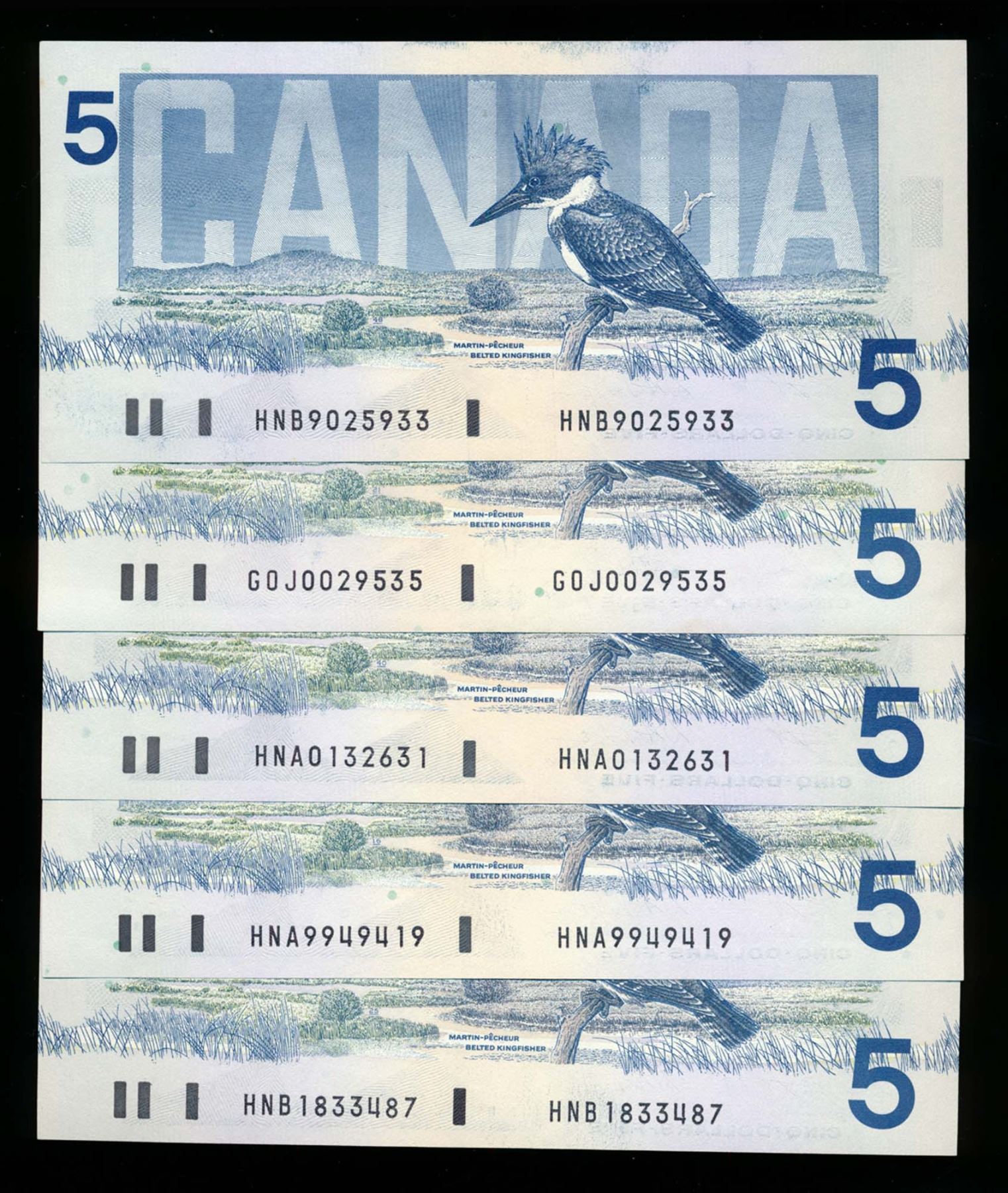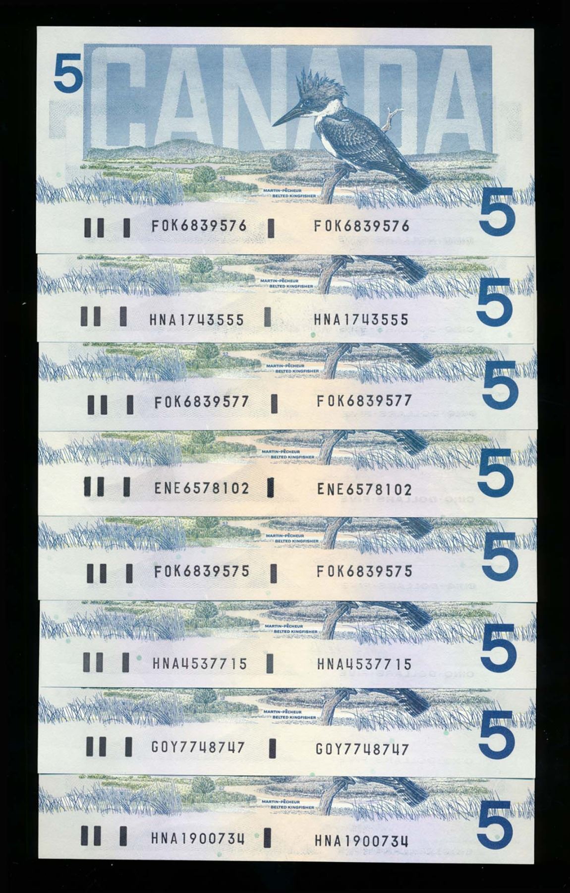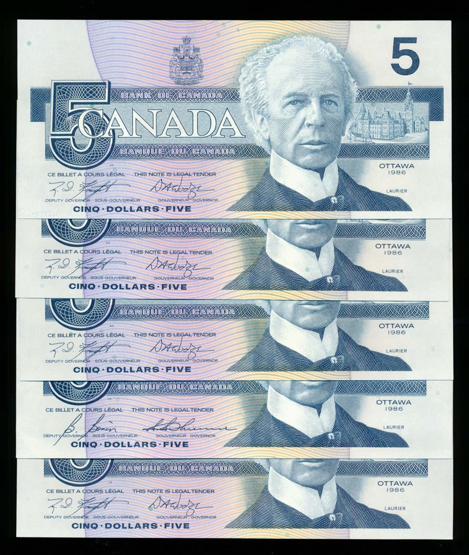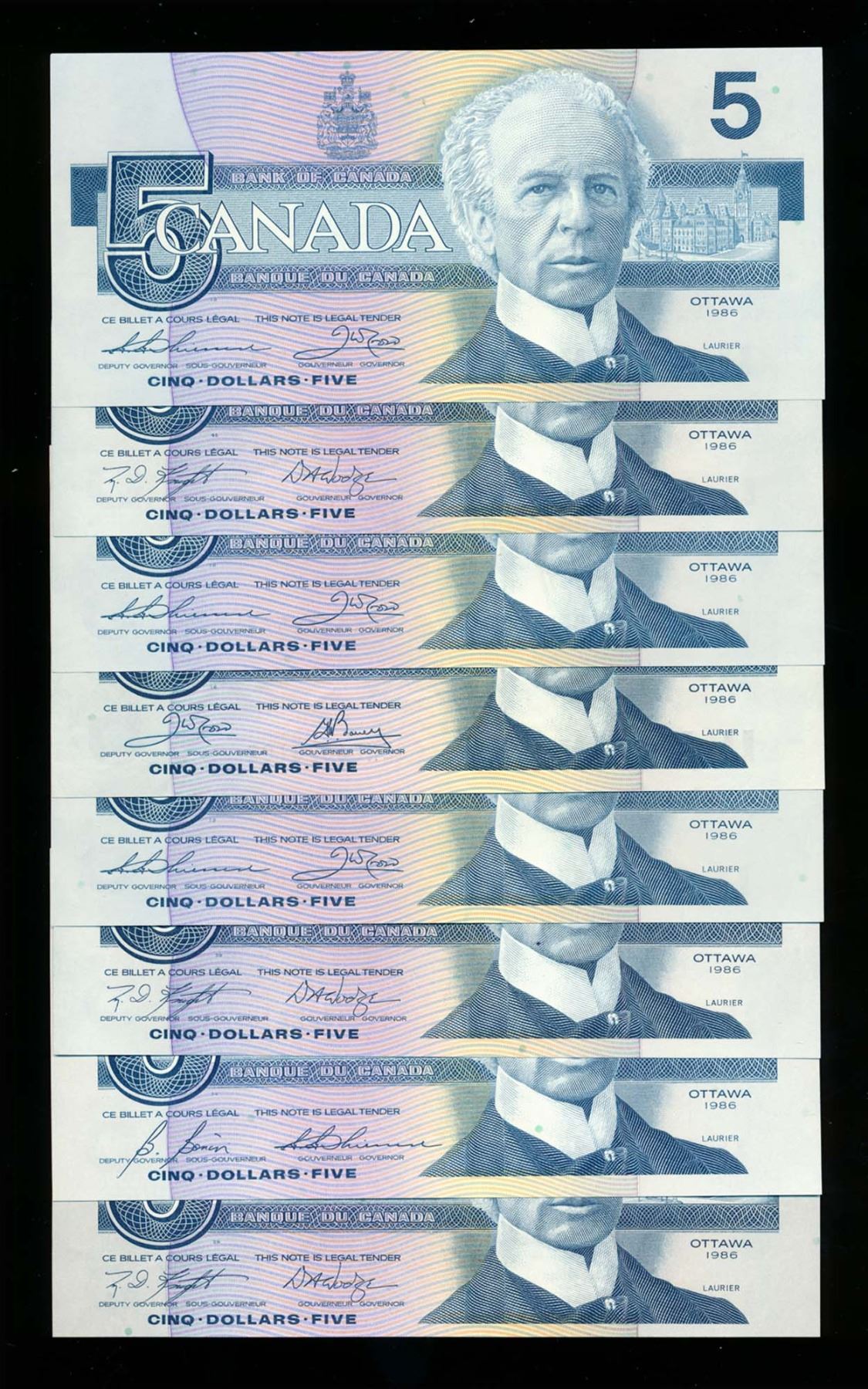 BANK OF CANADA $5.00 1986 A Lot of 13 notes BC-56. Mixed Signatures EF-UNC
