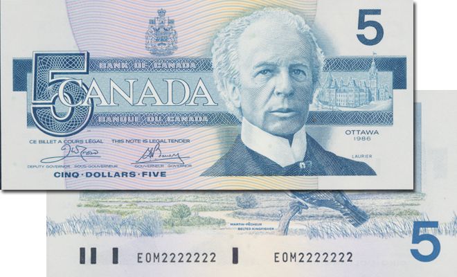 BANK OF CANADA. $5.00. 1986 Issue. BC-56a-i. Crow-Bouey. No. EOM2222222. PCGS graded Gem Unc-65.