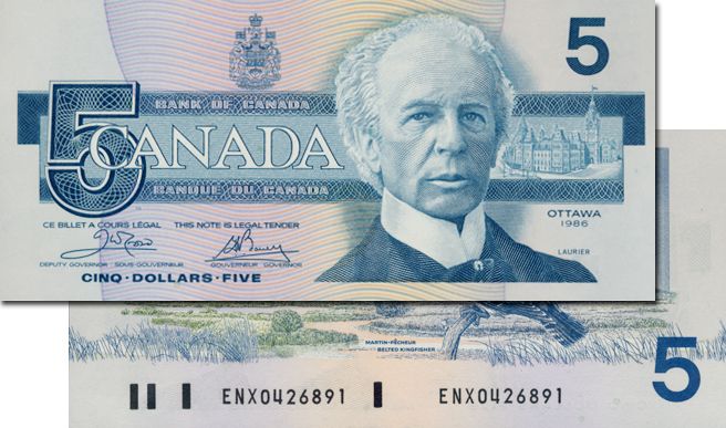 BANK OF CANADA. $5.00. 1986 Issue. BC-56aA. Crow-Bouey. No. ENX0426891. Yellow B.P.N. CCCS graded Unc-64.